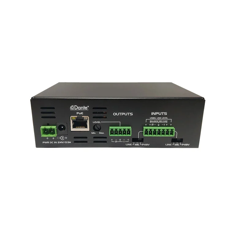このDANTE対応オーディオインターフェイスは、高品質のアナログからデジタルへの変換を備えた2つの構成可能なマイク/ライン入力を提供します。